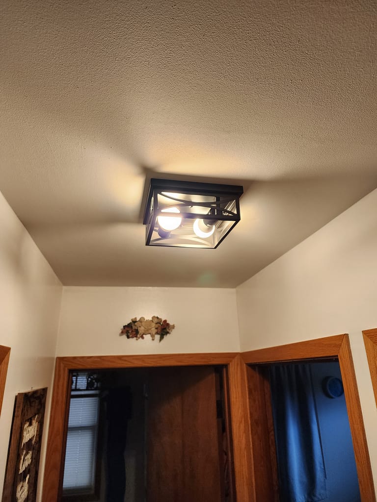 And honestly, it didn’t take much — a few coats of paint, some pine boards, and a bit of heart. It’s still a work in progress (we might add a new couch someday, maybe a real fireplace), but it doesn’t have to be perfect. It just has to feel right. We recently added a new light fixture in the hallway just off our living room, it’s also cozy but modern and we love it. I’ve added a picture of the new hallway look below.