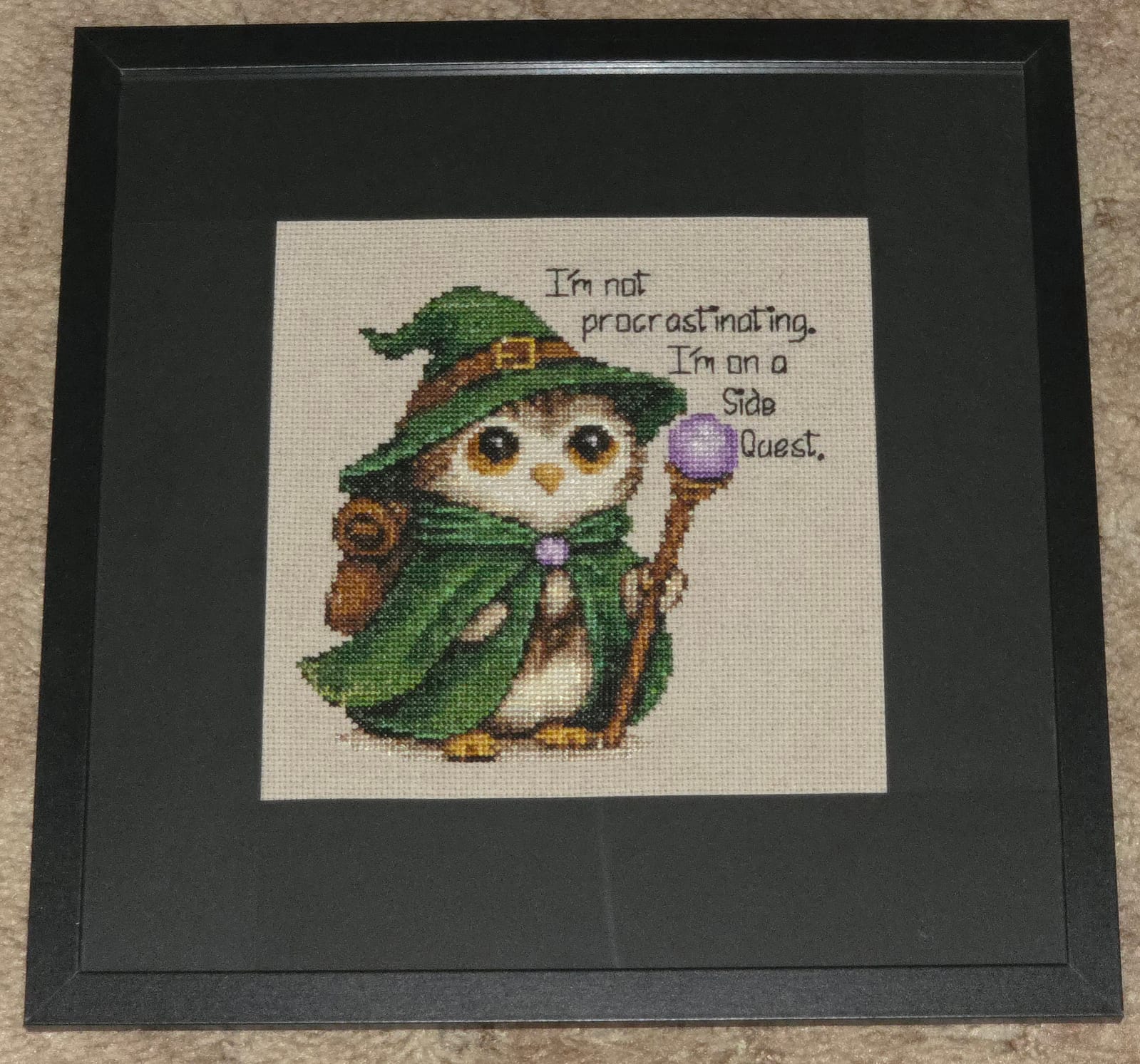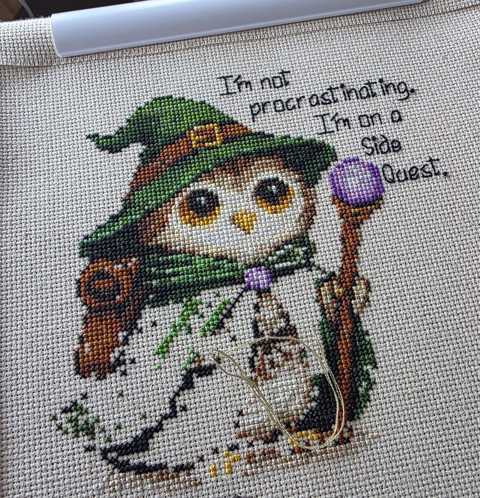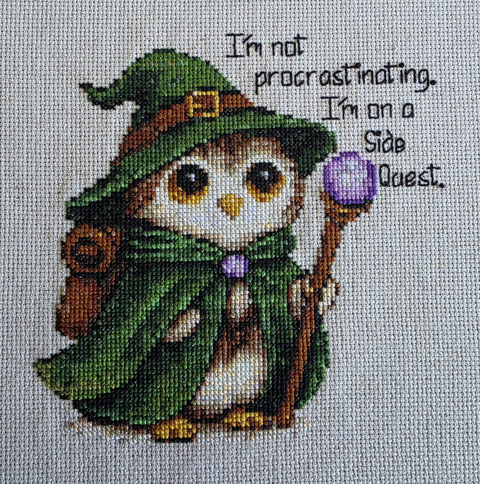 A whimsical owl wizard cross stitch design featuring the phrase: